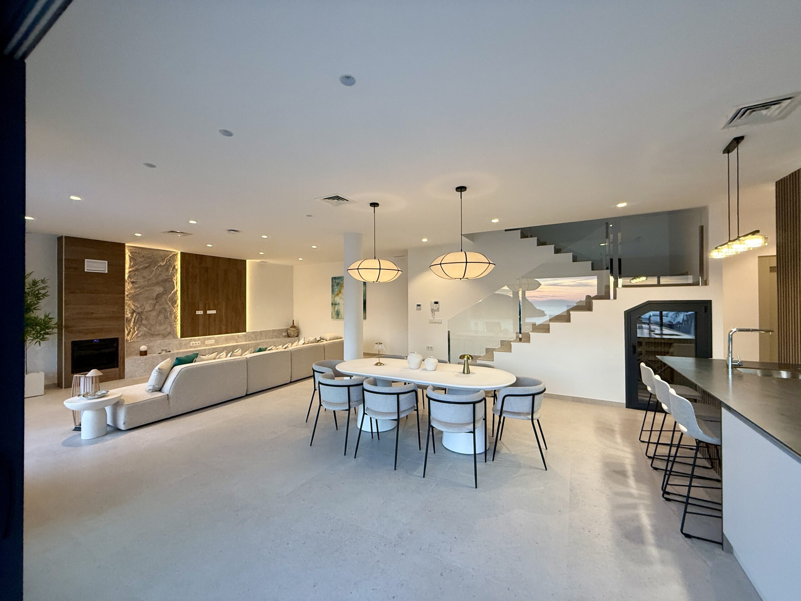 The lower level (ground floor) is the heart of the home, with a bright, open-plan living space, a fully fitted designer kitchen with island and premium appliances, and a fourth ensuite bedroom. Wall-to-wall windows allow for a seamless transition to the terrace and pool area, where you can enjoy open views toward the sea and mountains, especially during La Herradura’s unforgettable sunsets.